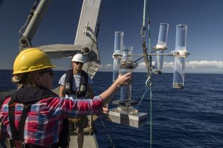 Melissa and Noah are working with two different novel instruments in this cruise. The first one is a time-lapse camera developed after repurposing her previous mobile. The phone will dangle at the base of a 150 meter wire, deployed as part of the Wirewalker assembly. For three or four days, the camera snaps pictures of the base of a sediment trap which collects falling particles called marine snow. Up until now, Melissa and her colleagues Colleen Durkin and Meg Estapa have been able to identify what kind of particles fall into the traps (and at what time this happens) by analyzing the material preserved in a special gel. They have also learned that particles fall in pulses as opposed to a steady flow. However, they are still not sure about which types of marine snow sink with each pulse, and how these are connected to the phytoplankton community above. They hope the images taken by the camera will provide a new piece to complete the puzzle that is carbon storage in the ocean.