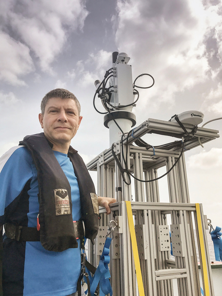 A radiometer installed in the bow of Falkor takes color measurements from both seawater and sky. SOI/Kristen Carlson