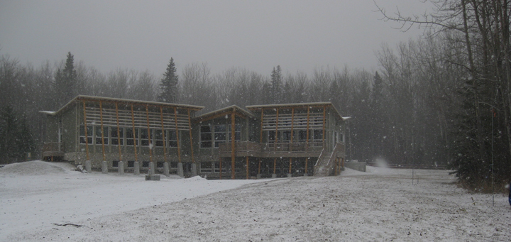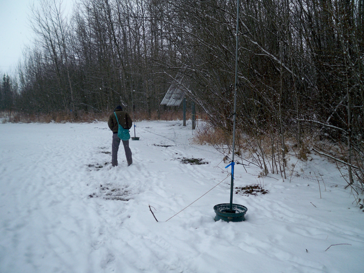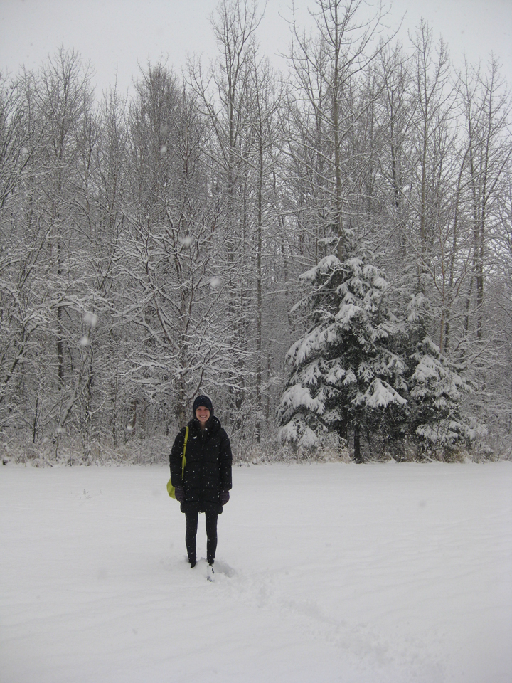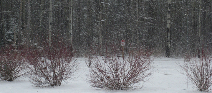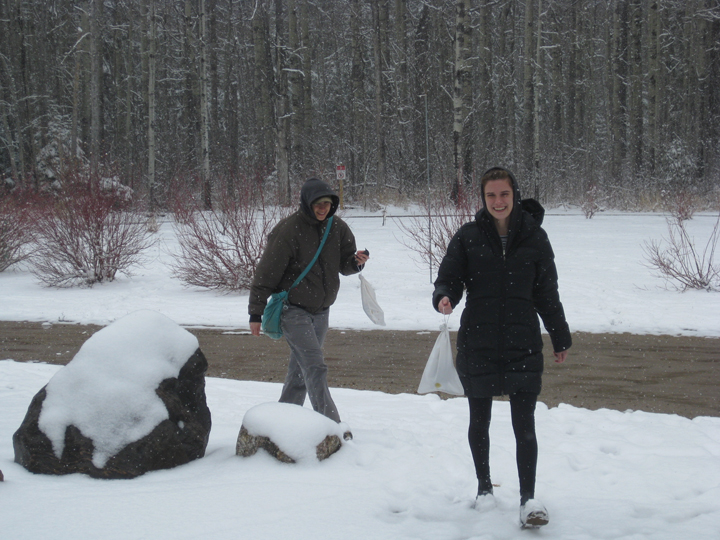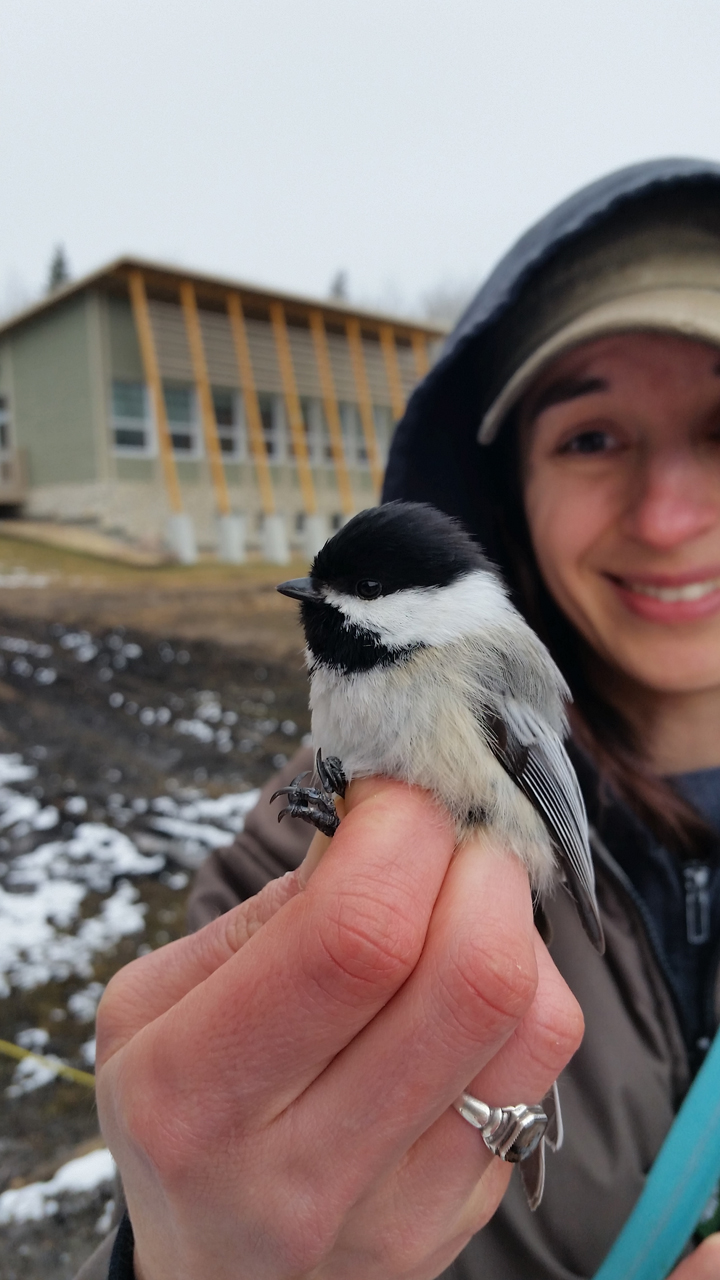 Boreal spring can look a lot like winter. Over the past three days the Boreal Centre has gotten snow, snow, and more snow. According to Nicole we’ve gotten more snow in the past few weeks than they got all winter! But snowflakes weren’t alone in the sky; we also witnessed a flurry of robin activity. The snow conditions on Sunday and Monday were harsh enough to prevent the robins from traveling, but not cold enough to discourage them from foraging. We spent both days pacing between the windows in the Boreal Centre watching a flock of about 50 robins flitting around the treetops. To encourage the robins to forage near our nets we did our best robin impressions and kicked snow away to reveal open spots of bare ground. Luckily for us, with the snowy conditions halting their migration the flock used the opportunity to fuel up. In just two days we caught 14 robins!