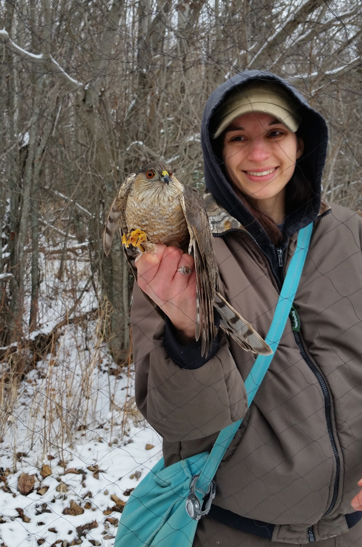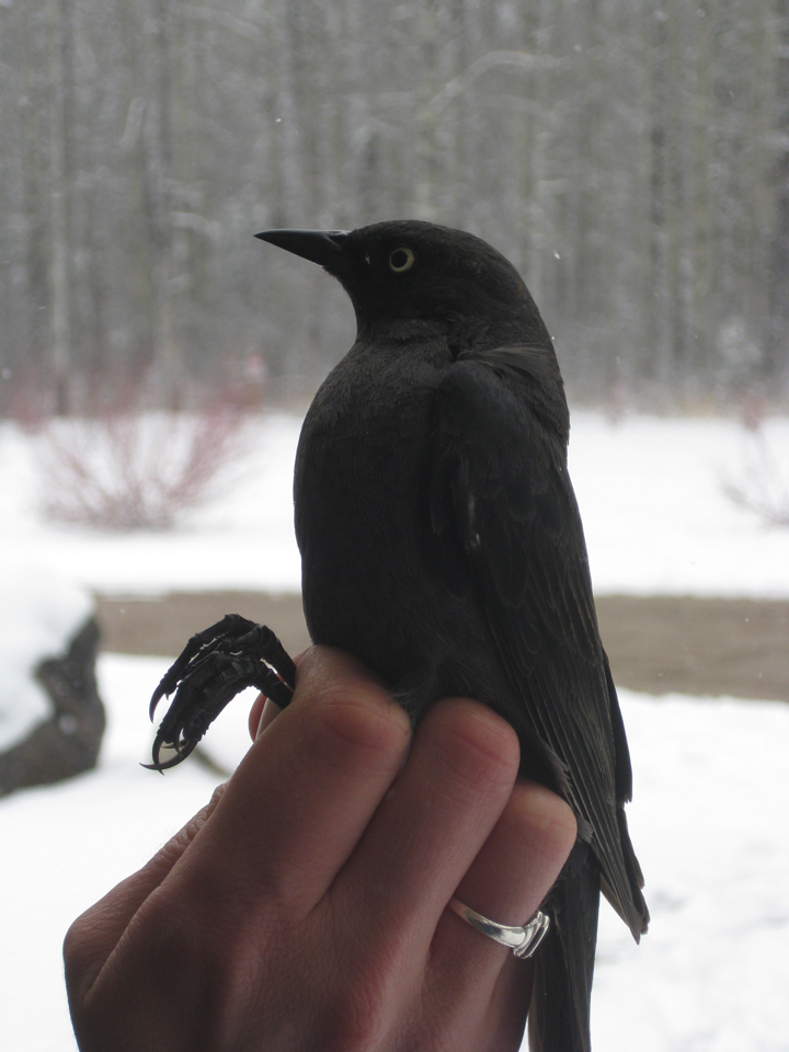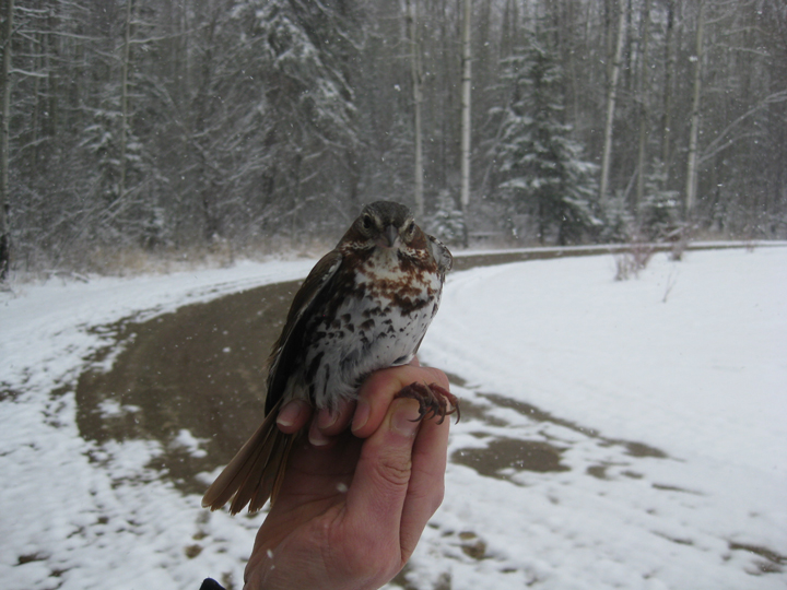 The robins and hermit thrush weren’t alone in exploring the snowy boreal forest. Plenty of Dark-eyed Juncos were out looking for food and we captured a Rusty Blackbird, Black-capped Chickadee, Fox Sparrow, and Sharp-shinned Hawk. The Rusty Blackbird also breeds in the boreal forest but is one of the most rapidly declining species in North America for reasons that are largely unknown. This particular Rusty Blackbird was the first one ever caught at the Boreal Centre! The Sharp-shinned Hawk follows a similar migration pattern to the robins. Although they are the smallest hawks in North America, they are fierce predators of the robins despite similar sizes. When we released the Sharp-shinned into the forest we learned why. As soon as we let her go, she quickly gained speed while navigating the dense thicket of willows.