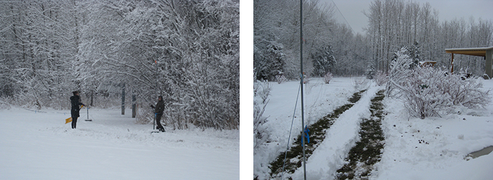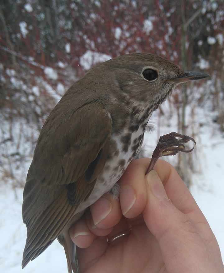 Despite the rising temperatures and sun breaking through the storm clouds as we rolled up our nets on Monday night, we woke up to the largest snowfall we’ve seen on Tuesday morning. The snow was so deep that we knew no robins would be able to forage on our field if we didn’t help them out. We grabbed our shovels and cleared foraging trenches around each of our nets, hoping hungry robins would take advantage of them. Unfortunately, Tuesday’s weather must have been stormy enough to convince the robins to take a true snow day as we only saw a couple of individuals. We only caught one bird but it turned out to be a relative of the robins, the Hermit Thrush.