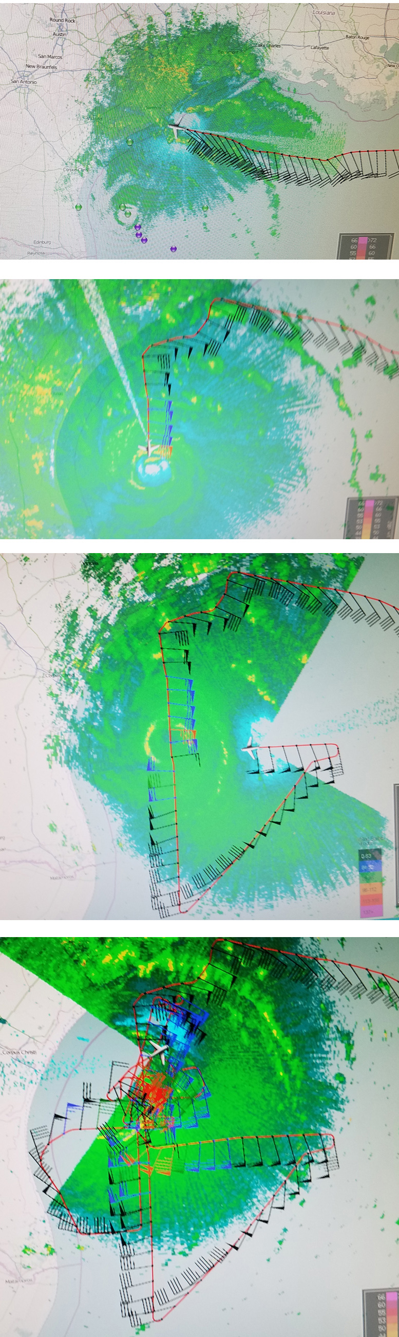 Over the next few hours, we conducted a total of six pairs of eyewall penetrations, each time circling to a new azimuth angle before entering the eye again in order to map out as complete an image of the storm structure as possible. With each successive penetration, the maximum winds encountered in the eyewall kept growing. We were experiencing firsthand Harvey’s rapid intensification phase as it strengthened all around us.