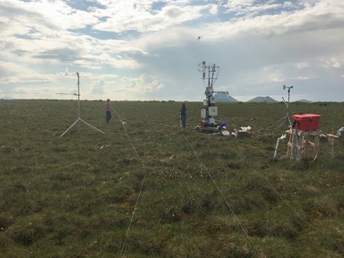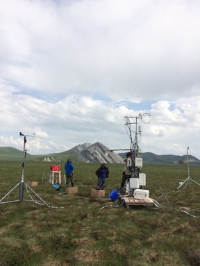 To improve our understanding of how large stores of soil carbon and Arctic vegetation are responding to climate change, a team of scientists participating in the NASA Arctic Boreal Vulnerability Experiment (ABoVE) recently gathered in Alaska to take part in a remote field campaign. Team members were Jennifer Watts (University of Montana; Woods Hole Research Center), Kyle Arndt and Andrea Fenner (San Diego State University), and Stephen Shirley (University of Montana). The objective of this campaign was to install a network of soil moisture and temperature sensors within the footprint of an eddy covariance flux (EC) tower located in Ivotuk, Alaska (Ivo-US, N 68.49 W -155.75). The EC tower measures carbon flux, or the direction and magnitude of carbon dioxide (CO2) and methane (CH4) gasses carried in turbulent surface winds, rolling across a roughly 1-km swath of land. These data are used to characterize and model ecological processes such as vegetation productivity, soil decomposition and respiration, and the net land-atmosphere carbon flux over Arctic/boreal regions.