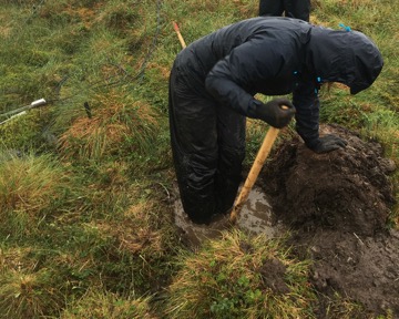 The majority of our Thursday was spent installing soil moisture sensors, three per site at 0-5 cm, 20 cm and 40 cm depths. Soil samples were collected for each site. We also measured the depth of the seasonally thawed soil layer overlying permafrost and the amount of water in the surface soils. Digging through frozen soil (in the rain) proved challenging. Sites with shallow thaw depths were even more work. First, we removed the thawed soil. Then we shoved out the frozen soil layer in little chunks, similar to scooping ice cream. Digging through the frozen soil for 10 cm or more took a lot of time and energy. After a late dinner, with our installation complete, we took an evening trip to the power shed to finalize the datalogger programming.