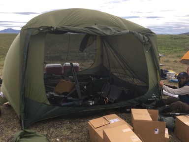 Late in the afternoon while Jennifer and I were finishing our second set of stream samples, Kyle and Andrea radioed that the cooking tent was about to fly away. Stormy weather was moving in. When I arrived at camp I saw Kyle and Andrea doing their best to hold down the tent. Our campsite was a mess. Everything had been blown around, inside and out, by the wind. We lost some time reorganizing our equipment and supplies, and securing the other tents. The rest of the evening was spent tying up loose ends on the independent projects, finishing stream samples and taking GPS points for Kyle’s measurements. After a late dinner, we made our daily trip to the power box to send emails and confirm that our flight out had been scheduled for the next day.
