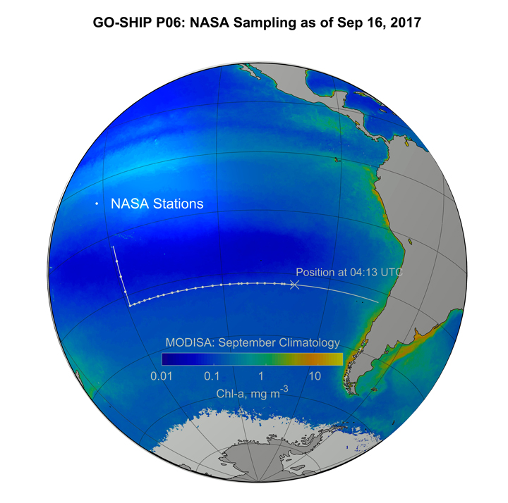 Our Global Ocean Ship-based Hydrographic Investigations Program (GO-SHIP) P06 campaign departed Sydney, Australia, on July 3, successfully ending the first leg of this journey on August 16 in Papeete, French Polynesia (Tahiti). This is where our team from NASA Goddard Space Flight Center (Scott Freeman, Michael Novak, and I) joined dozens of other scientists, graduate students, marine technicians, officers and crew members, for the second and final leg that will end in the port of Valparaiso, Chile, on September 30. The GO-SHIP program is part of the long history of international programs that have criss-crossed the major ocean basins, gathering fundamental hydrographic data that support our ever-growing understanding of the global ocean and its role in regulating the Earth’s climate, and of the physical and chemical processes that determine the distribution and abundance of marine life. This latter topic regarding the ecology of the ocean is what brings our Goddard team along for the ride.