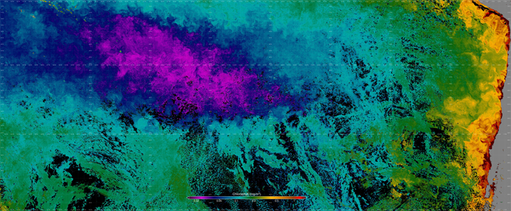 Due to the physics of fluids on a rotating sphere, such as our planet, the upper ocean currents slowly rotate counterclockwise around the edges of the center of the Gyre–as a proper Southern Hemisphere gyre should—and a fraction of that flow is deflected inward, towards its center. With water flowing towards the center from all directions, literally piling up and bulging the surface of the ocean–albeit, by just a few centimeters across thousands of miles–gravity pushes down on this pile of water. This relentless downward push puts a lock on life. The pioneers of life in the ocean, the tiny microscopic plants, known as phytoplankton, which drift in the currents, and grow on a steady mineral diet of carbon dioxide, nitrogen and phosphorus, and a dash of iron—and expel oxygen gas as a by-product, to the great benefit of life on Earth—must obtain most of their material sustenance from the ocean below. Layers of denser water trap the nitrogen and phosphorus-rich water at depth, keeping it too far down, where not enough light can reach it to spark the engine of photosynthesis that allows plants to grow.