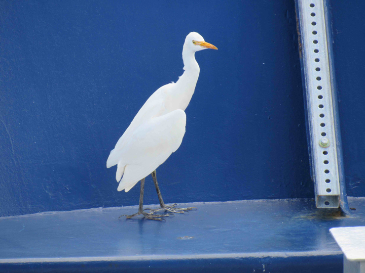It started this time with me thinking about blue birds – not literally a blue bird, but birds feeling lost and blue. Yes, that is probably stupid anthropomorphism, but it is the kind of conversation that gets going after weeks at sea. We have not one, but two, Great Egrets on the ship right now. I am sure they are very blue, even though they are perfectly white in color. Their usual home is possibly some cushy Florida suburban swamp stalking frogs and small fish. The summer is ending so they decide to head off to the other summer home in the Amazon, where you can snack on frogs and small fish. Then, bam! Some big wind comes along and all you can see day after blue day is blue sky and blue water. And this is likely some kind of Alice in Wonderland experience for a lost freshwater fowl – the fish are flying and the frogs look like sharks, and all of a sudden the water is 2 miles deep instead of 2 inches deep! Those long slim legs for wading are way too short now.