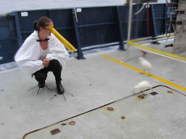 This voyage has been blessed with a small side-show by a couple of Egrets. They seemed near death when they joined the ship late last week. After taking on some food and freshwater, thanks to Trina from UW APL, they are taking ownership of the fantail of the ship and providing good entertainment. I will keep you apprised of their situation.