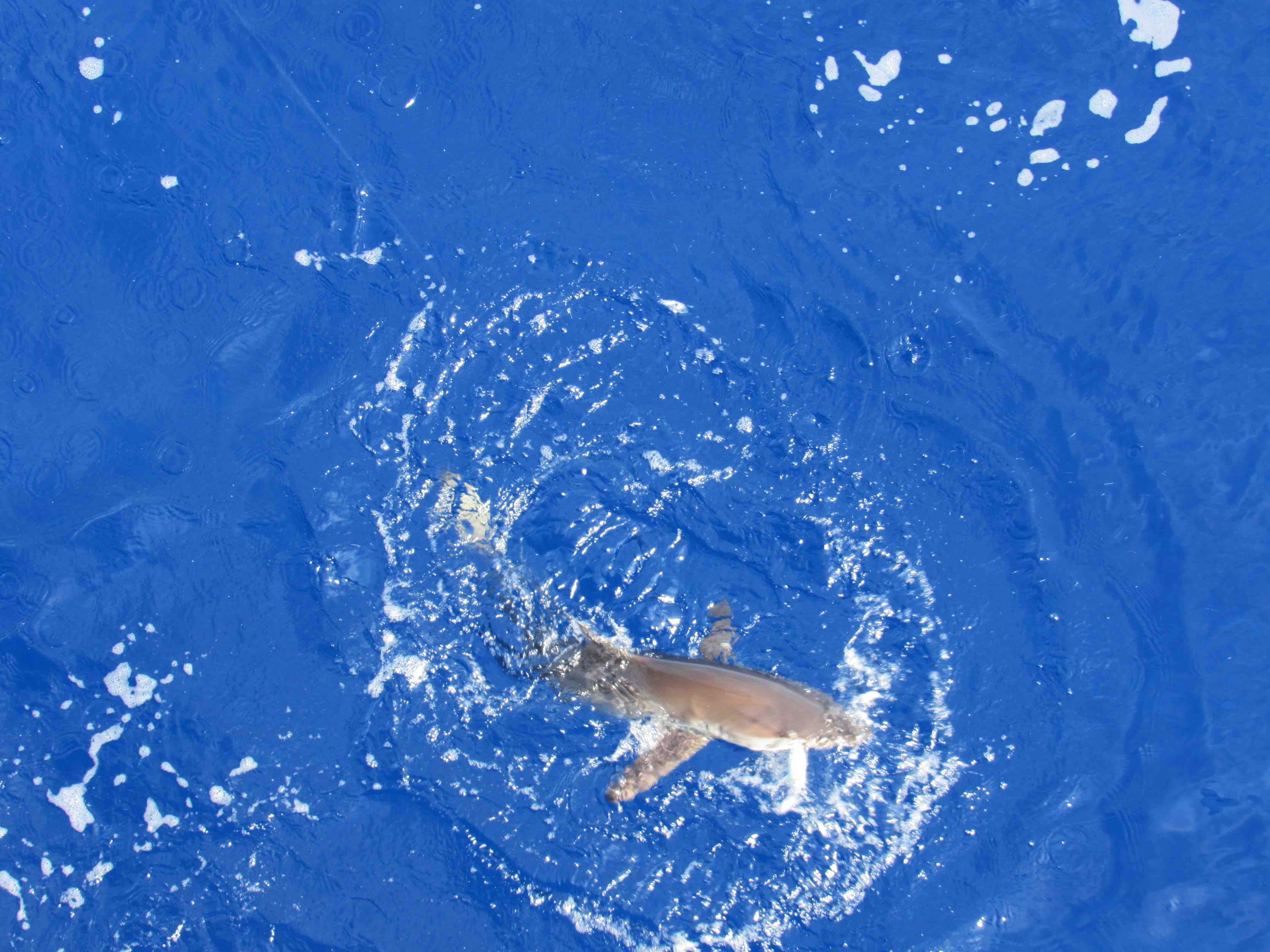 Once aboard the buoy the footing is slippery with seawater and guano, so the discipline of a rock climber is required. It may be only a short way down, but who wants to splash around with hungry sharks? One only has to recall the fishing, of days recently past, where on one cast all that was brought aboard was the lure and the head of the tuna; the sharks having won an easy and quick dinner. Best to hold on tight. Ben said his knees were sore from clamping down hard on the buoy while using both hands to get the meteorological gear free and stowed.