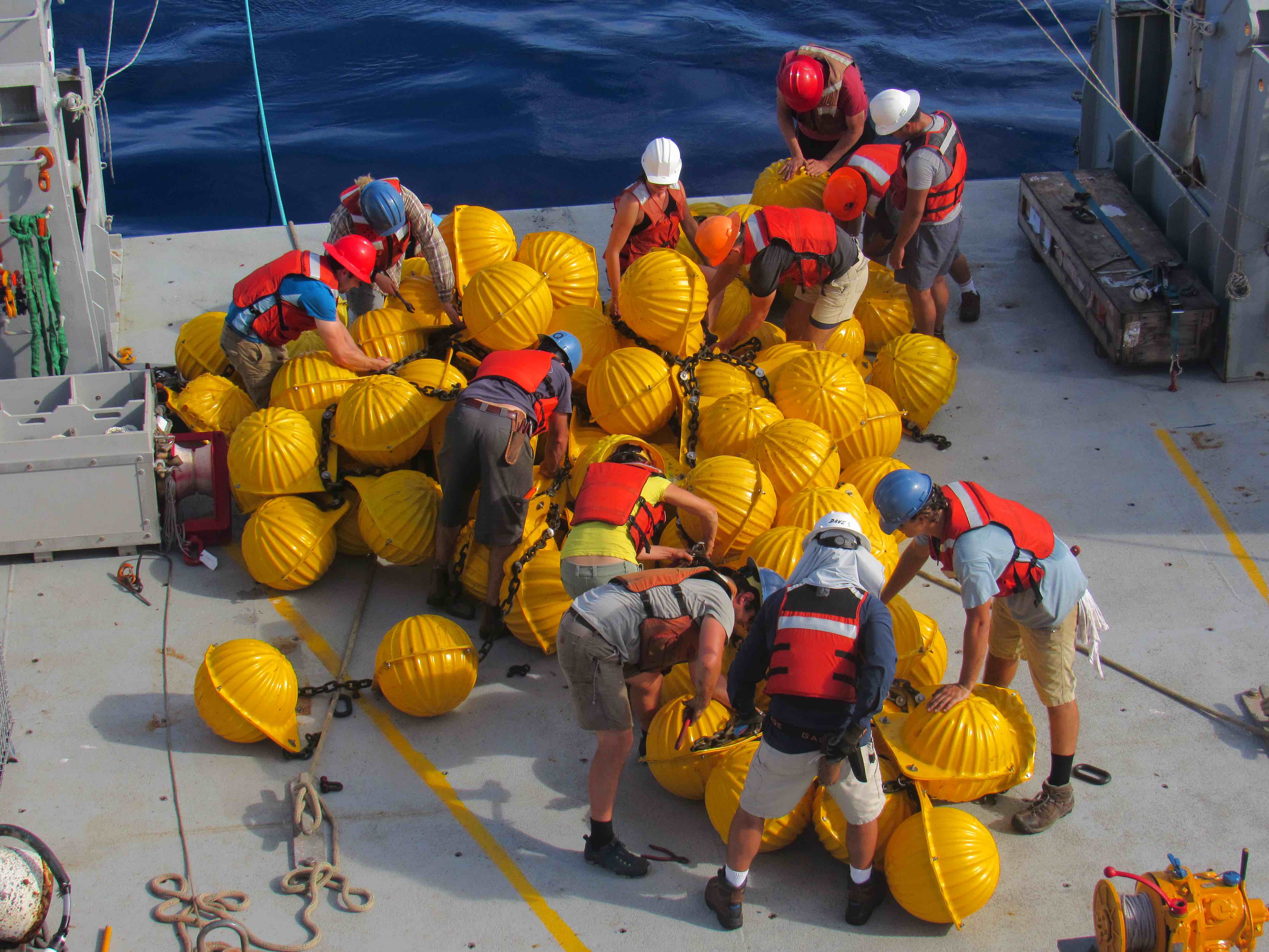 One of the reasons our work requires a large research vessel is that we are dealing with large arrays of sensors moored in the deep ocean. That requires big buoys, lots of rope and wire, lots of floatation, and big anchors with very strong and steady human guidance.