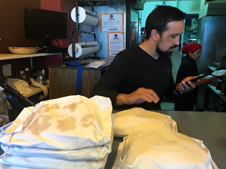 Every evening, De Marco opens an Excel spreadsheet and records the orders of approximately 15 people. The orders are tallied and delivered via text message to Nicolas Furlanetto, owner of Ushuaia restaurant Doña Lupita. The next morning, Furlanetto and his staff arrive at the restaurant by 6:30 a.m.—hours earlier than on a typical day. Anywhere from 23 to 85 fresh empanadas are lifted from the wood-burning stove, neatly wrapped in paper, and labeled with our names.