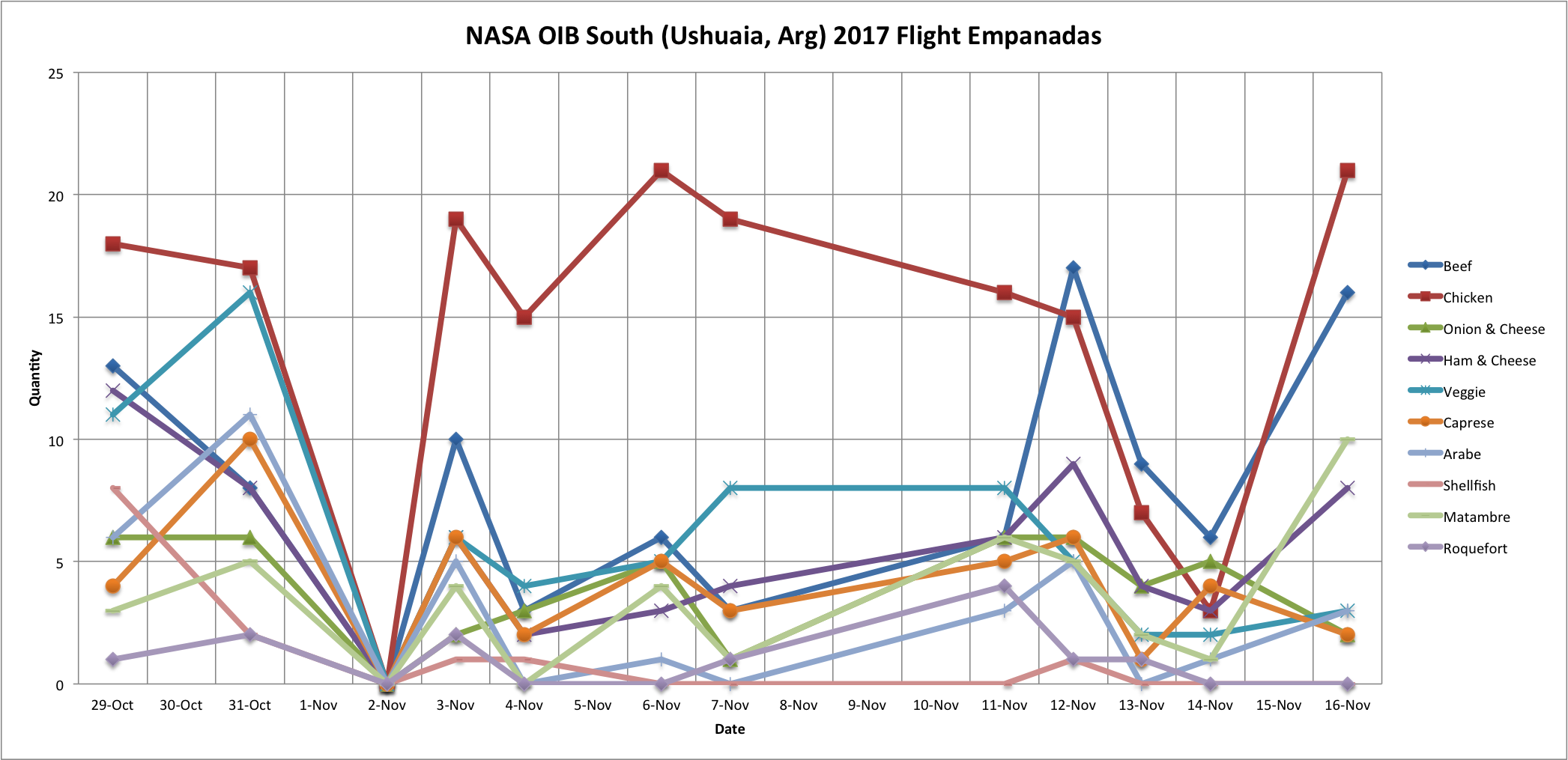But that doesn’t mean instrument operators and crew go hungry. In addition to working with the airport and local government to ensure paperwork is in order, Operation IceBridge deputy project manager Eugenia De Marco also takes on the task of ordering and procuring daily orders of … what else … empanadas. And she approaches the task like only an engineer would.