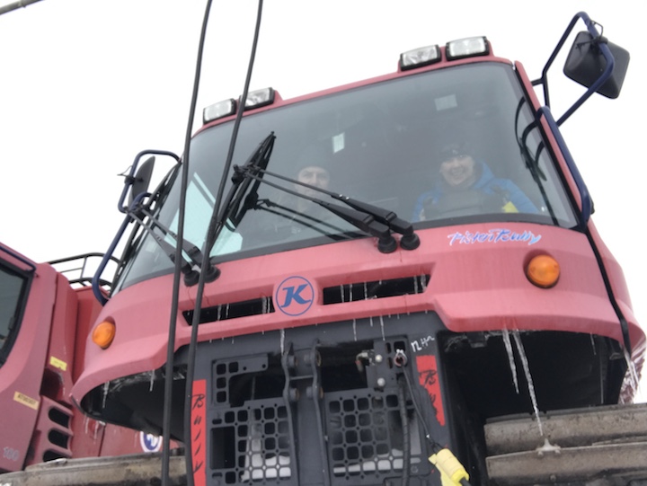 Tom and Kelly inside a PistenBully, like the one they’ll use for the traverse along 88 degrees south.(Photo: Brunt)