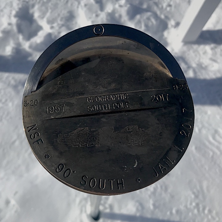 There is a marker placed at the geographic South Pole, designed by the wintering crew at the station. Every year on January 1, the new marker is placed and the marker from the past year is put on display inside the station. Since the entire station (and skiway, and cargo, and traverse vehicles) are on top of the ice sheet, the whole station moves along with the ice. The ice shifts about 30 feet per year toward the 40 degrees west line of longitude where it eventually becomes part of the Filchner-Ronne ice shelf. (Don’t worry though, at the current velocity, it will take tens of thousands of years to get there.)