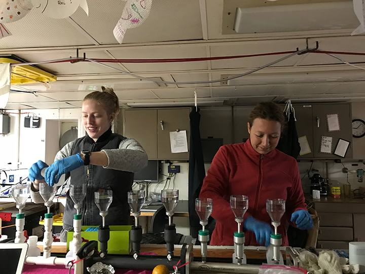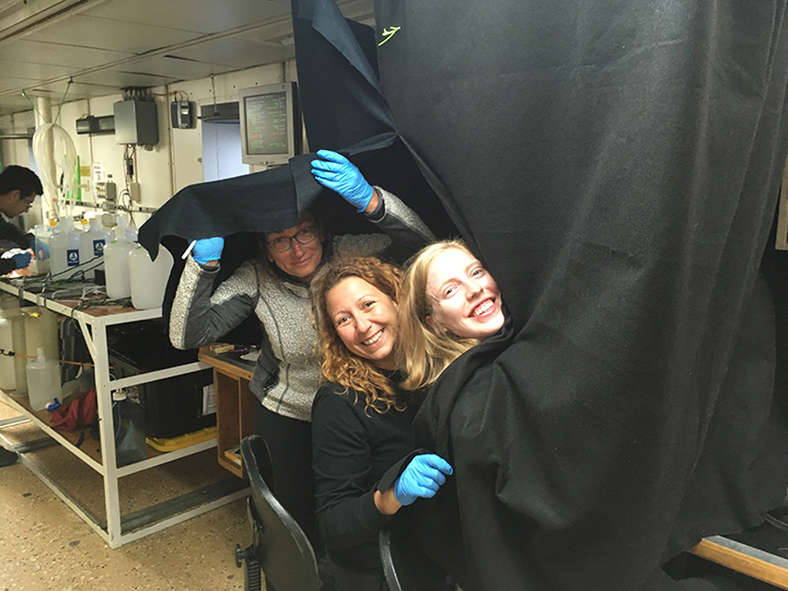 Dim the light in the main lab, and draw the black curtain! This is the time for the daily after-dinner excitement! Except that the only thing that really gets excited during those evening sessions is the chlorophyll that my two teammates and I are getting ready to measure! We, on the other hand, are not too thrilled when facing the 204 tubes that need processing. Considering that our day started with the 2 am cast, and that so will the next day, even with a short afternoon nap, we want the night show to be as short as possible.