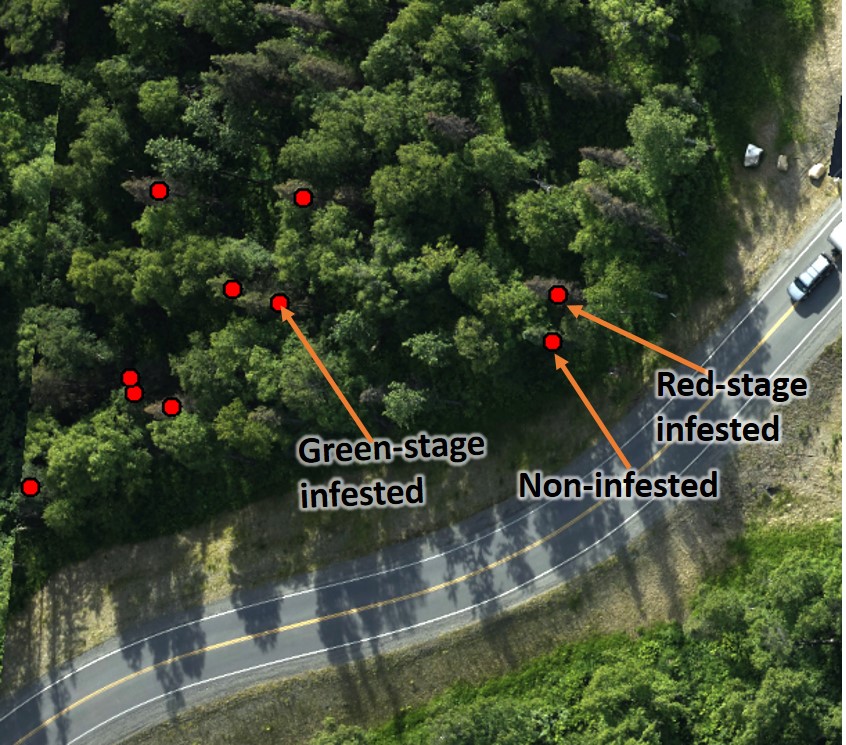 Our task was to find and GPS spruce trees within the collected GLiHT imagery and record their infestation status and size so that they can later be used to develop infestation detection algorithms for aerial and satellite imagery. Spirits were running fairly low until we found a big patch of both green-stage infested trees (those that are infested with spruce beetles but have yet to show visual signs in their needles) and non-infested spruce trees. This find was especially exciting because these infested and non-infested trees were experiencing similar site and weather conditions, so differences that we detect in the GLiHT imagery will likely be due to the effects of the beetles, giving more confidence to the infestation detection algorithms that we develop.
