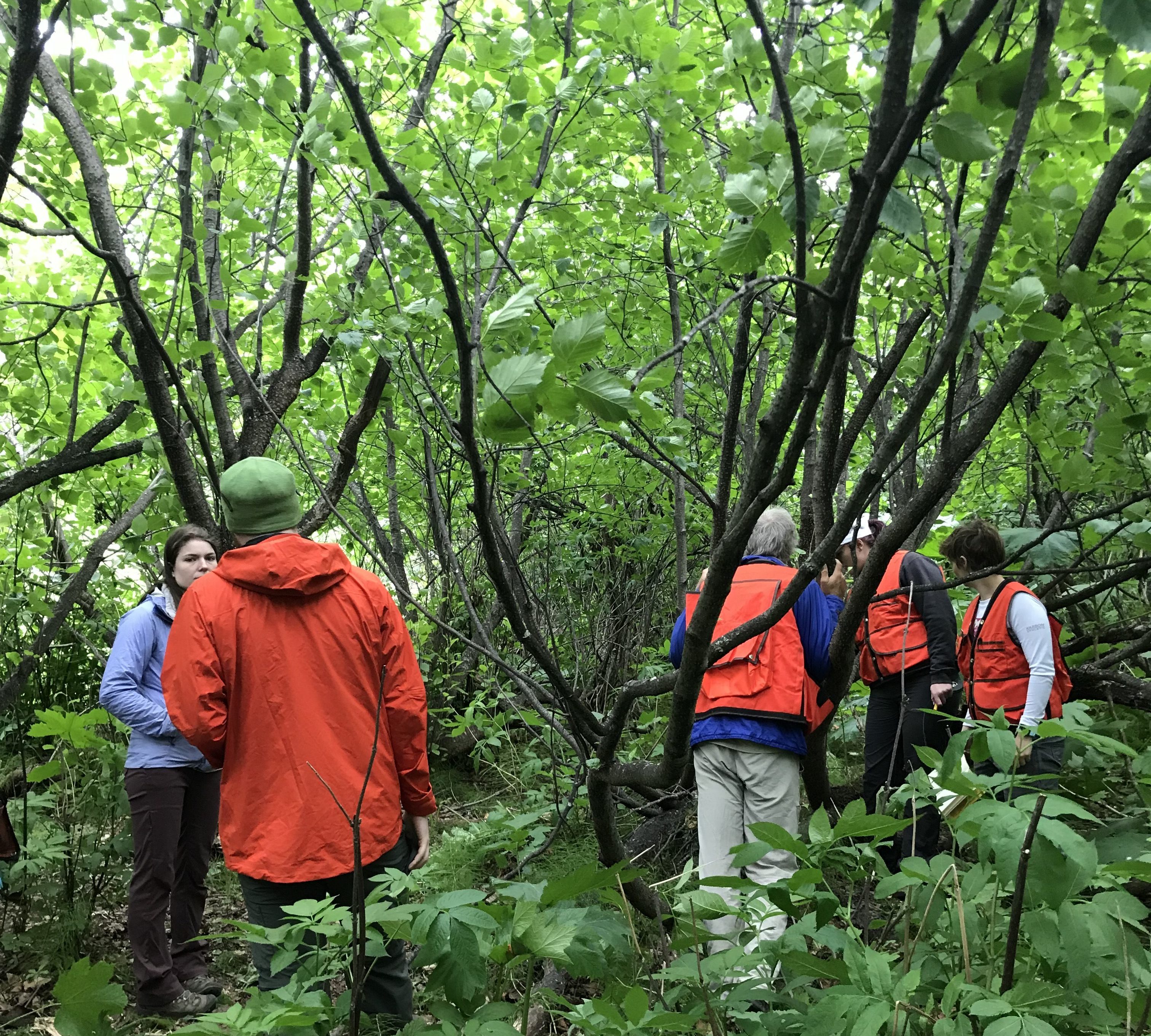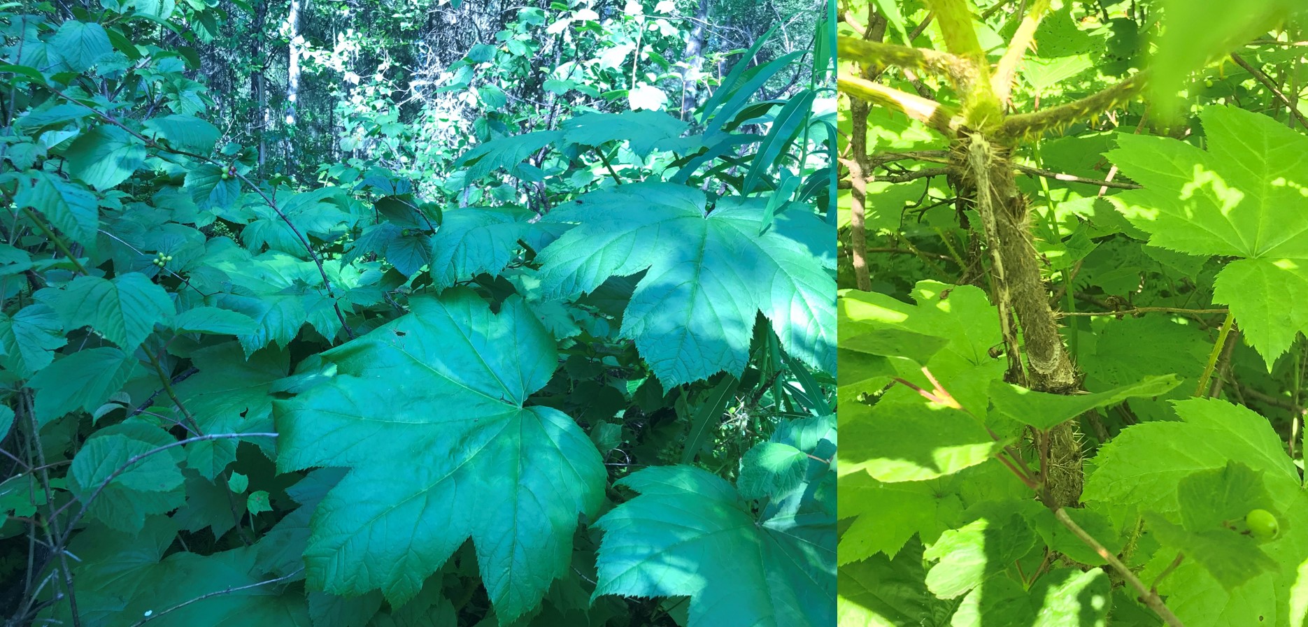 This week while the GLiHT crew continued collecting data over the Susitna and Tanana valleys, we focused on collecting on-the-ground data on spruce beetle infestation. Our first day out proved rainy and cold, but we pressed on, only sheltering in the car during a particularly hard spell. Aside from the occasionally torrential rain, we also dealt with clambering over downed logs nearly invisible under thick grasses and ferns, as well as waist-high patches of Devil’s club. This nasty understory shrub is covered in painful thorns tough enough to penetrate through clothing. We often found ourselves having to backtrack and find a different route to our desired tree after realizing we were wading into a sea of the spiky shrubs. As a testament to this somewhat failed effort, my legs were covered in scratches and bruises later that evening.
