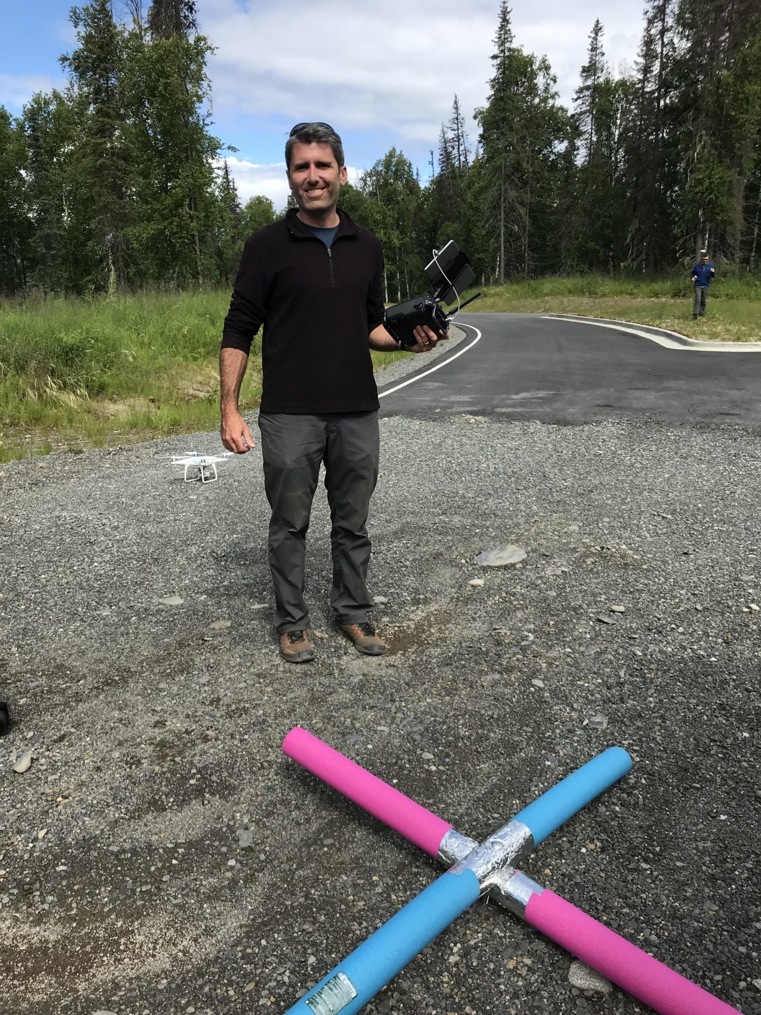 The American University team introduced us to some “field equipment” I never thought I would be using: foam pool noodles bolted together in an X formation. They are used as targets in the UAV imagery along with high-accuracy GPS points to post-process the collected imagery. A GPS point is collected at the center of the pool-noodle X, and then later the image is warped so that the center of the X (the bright pool noodles make for highly visible targets) matches the GPS’d point. This process makes sure the image is spatially accurate, and also makes for some entertaining field work.