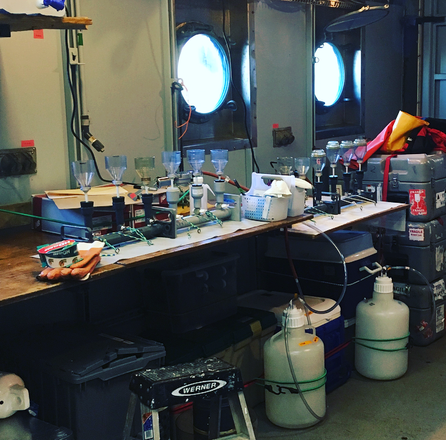 No matter how prepared scientists are, unexpected things always happen at sea, including 12-foot swells sloshing up against the side of the boat. That might not seem like much for an avid surfer, but for research vessels these waves can be felt instantaneously by members. I remember my last research cruise, when we hit a wave a bit larger than I expected. I was performing an experiment and zoom, all of the bottles starting sliding across the table. Here I was trying to catch them while holding my stance. In times like these, I truly appreciated that the tables were screwed into the walls, and the boxes under tables were held in place with ratchet straps.