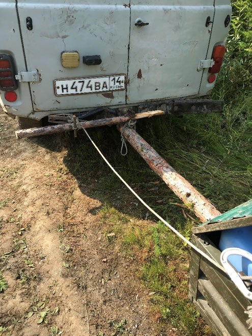 At the camp site, we were accompanied by five locals from Batamay: a guard, a driver, two cooks, and a guard dog. It was comforting to have this company and it is safe to say that this made all of us sleep better at night. In a matter of minutes a patch of tall grass was transformed into a cosy camp site including a fire place, picnic table and food warehouse, all made from the branches and logs available in the forest, and some old containers used previously by road constructors. Another great example of what you can construct from logs: a trailer able to withstand all bumps we faced on the road.