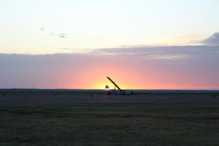 I’d like to welcome you back to the ballooning extraordinaire blog. As is normally the case, the weather in Ft. Sumner has been gracious enough for us to conduct our first successful flight of the campaign. Our first flight was conducted by the BOBCAT team. You can see in the photo (below) the payload gondola and our Mobile Launch Vehicle beautifully backlit by the New Mexican sunrise. The gondola is the structure that carries all the stuff that the science team needs to make their experiment work. The BOBCAT mission is a testbed demonstration for a cool, new type of cryogenic liquid containment system for balloon-borne telescopes. A lot of people might not know that cryogenic liquids are gases that have been cooled and compressed for so long that they actually turn into a liquid.