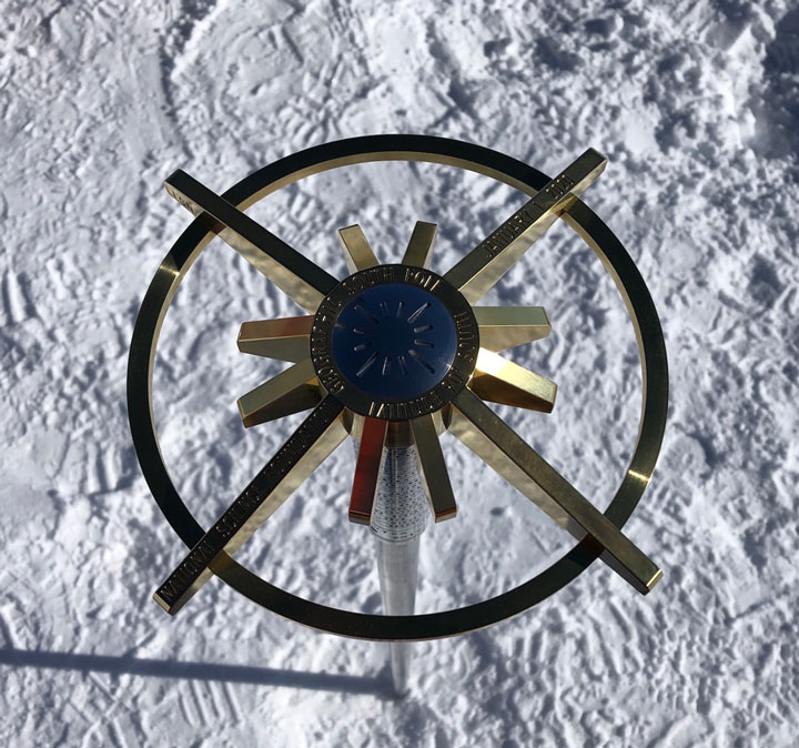 The coolest thing about spending the New Year at the South Pole is the 1 January ceremony to place a geodetic benchmark on the geographic South Pole, or 90°S. Ice sheets are dynamic; they move under their own weight very slowly, like thick maple syrup moving toward the edge of your pancakes. Thus, South Pole Station is slowly moving away from the geographic South Pole. Every year, on the first of January, a new benchmark is placed on the surveyed geographic South Pole. The benchmark itself is designed by the science-support crew that spends the long, isolated winter at the station, ensuring that continuous scientific observations are kept running!