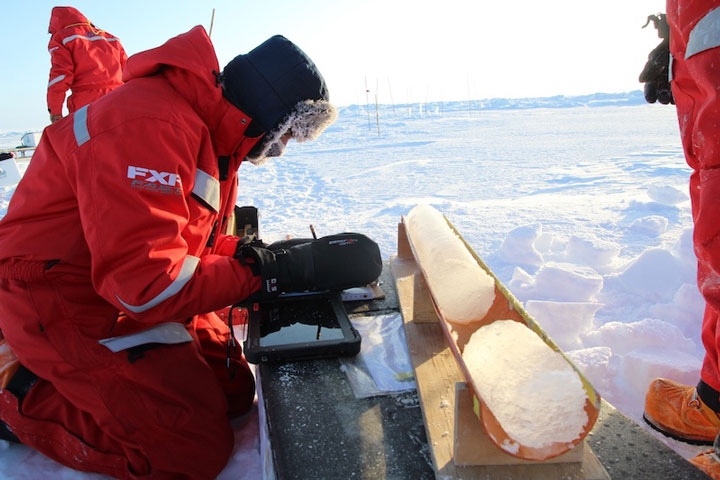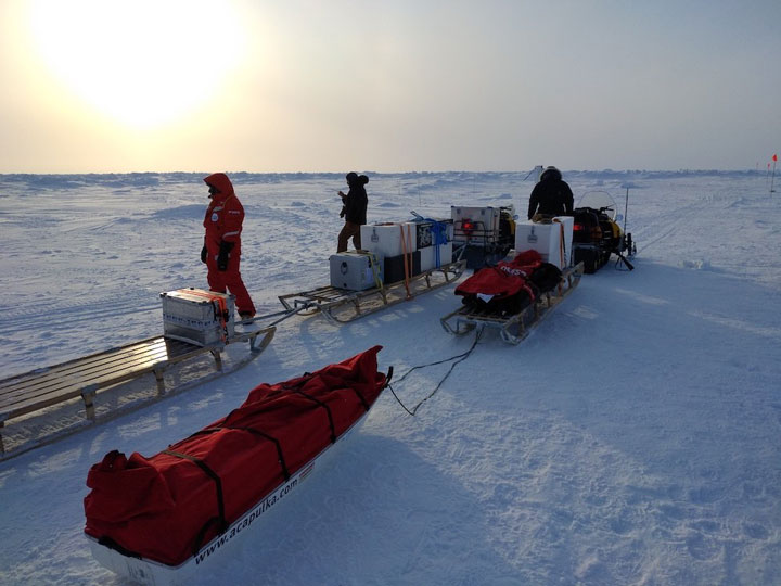 08:00: After a quick breakfast, the team meets to load all the coring gear onto the ice floe. Our whole operation requires 4 snowmobiles, each one pulling two 10-foot-long sleds filled with coring equipment. By 9:00, our teams are packed and ready to go. We are joined by two polar bear guards from the logistic team, and set off for the Dark Site. My team heads to the First Year Ice site (FYI) while the other group goes to core at the Second Year Ice (SYI) site. If you’re lucky, you can get a seat on the snowmobile. Otherwise, it’s a long bumpy ride sitting on the wooden sled.