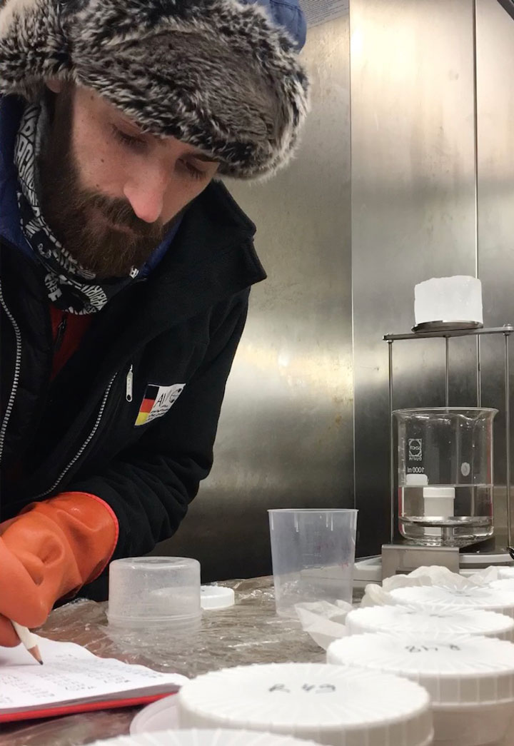 20:00: Processing begins. Some cores need to be processed the same day, so many of us head to our labs to work on the samples that we drilled. I run some core sections through a centrifuge to remove and analyze the brine, and measure the ice density on other sections.