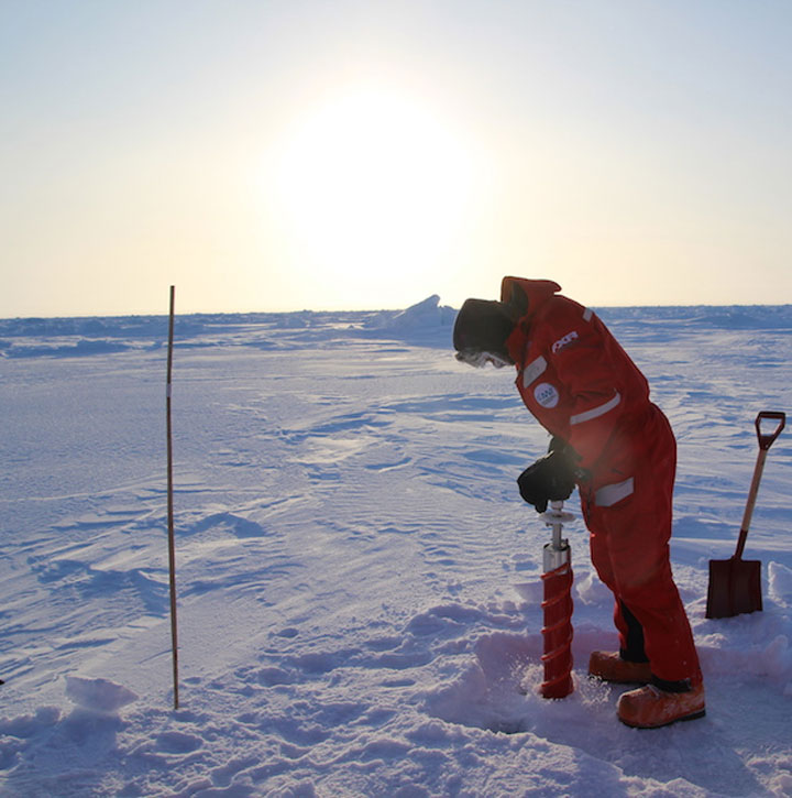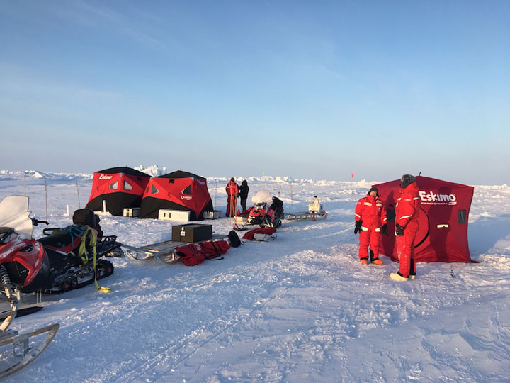 08:00: After a quick breakfast, the team meets to load all the coring gear onto the ice floe. Our whole operation requires 4 snowmobiles, each one pulling two 10-foot-long sleds filled with coring equipment. By 9:00, our teams are packed and ready to go. We are joined by two polar bear guards from the logistic team, and set off for the Dark Site. My team heads to the First Year Ice site (FYI) while the other group goes to core at the Second Year Ice (SYI) site. If you’re lucky, you can get a seat on the snowmobile. Otherwise, it’s a long bumpy ride sitting on the wooden sled.