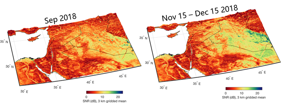Measurements by CYGNSS over land are used to determine soil moisture content under dense vegetation. This, in turn, allows for the identification of conditions conducive to major locust outbreaks in East Africa. Locating locust breeding grounds before the insects are mature and able to fly provides a unique opportunity for eradication efforts on the ground. This capability is being investigated through a partnership between members of the CYGNSS science team, NASA SERVIR, the U.S. Agency for International Development (USAID), and the United Nations Food and Agriculture Organization (FAO). For more information, refer to this Image of the Day published in March 2020.