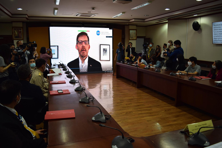 The press event took place at the Ministry of Natural Resources and Environment in Bangkok, and included remarks, a tool demo, and a Q&A session—and I got to watch it all live online. With about 40 participants, the event featured speakers such as: Mr. Athapol Charoenshunsa, PCD Director General and Chairman of the event; Dr. Steven G. Olive, Mission Director of USAID’s Regional Development Mission for Asia (RDMA); Dr. Lawrence Friedl, Director of NASA Earth Science Division’s Applied Science Program (through a pre-recorded video); and Mr. Aslam Perwaiz, Deputy Executive Director of the Asian Disaster Preparedness Center (ADPC). Additionally, GISTDA, the National Research Council of Thailand, the Prime Minister’s Delivery Unit, the Thai Health Promotion Foundation, the Department of Health, and about 20 local media channels and newspapers were at the event.