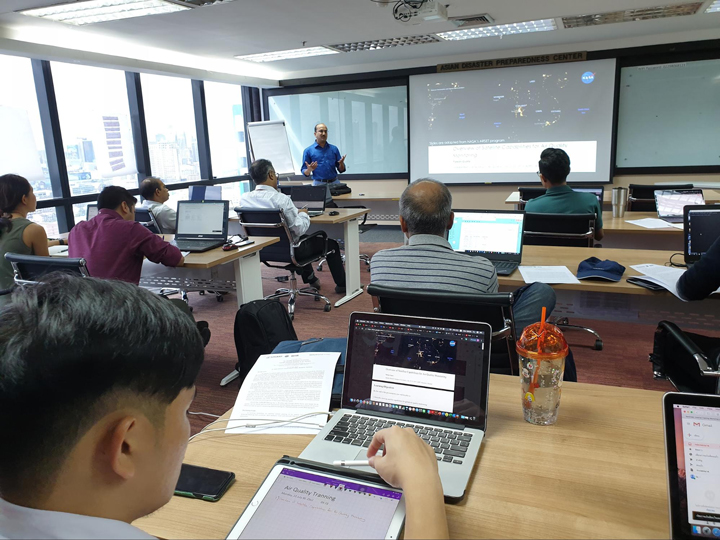 I learned a lot about Air Quality monitoring from Dr. Gupta, the lead scientist of the AQE. He told me that in the past two decades, satellite observations of atmospheric aerosols and trace gases have been used to address surface air pollution issues. NASA has invested significant resources in researching and developing data products ready to be used in applications. The products used for the AQE are created through a research and analysis (R&A) project of NASA’s Science of Terra, Aqua and Suomi-NPP program (PI – Dr. Pawan Gupta). The R&A project focuses on air quality research and data product development for the Indian-Subcontinent, which has been expanded to include Thailand in collaboration with SERVIR. “AQE is an excellent example where NASA’s R&A program collaborated with NASA’s Applied Science program to use science for real-life application,” said Dr. Gupta.
