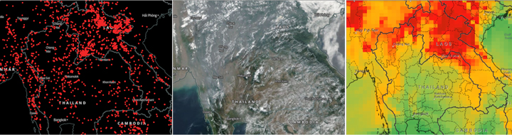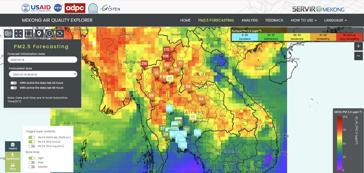 On November 23, the Royal Thai Government’s Pollution Control Department (PCD) and SERVIR-Mekong launched the Mekong Air Quality Explorer (AQE) tool at a press event in Bangkok, Thailand. Due to ongoing COVID restrictions, my colleagues from the SERVIR Science Coordination Office (SCO) and I participated in the event remotely. In working with the SERVIR-Mekong hub, I learned that poor air quality in Southeast Asia is a recurring problem that has lingered for over a decade. In contrast to smaller numbers of ground monitoring stations, Earth observations have proven essential to provide consistent and accurate air quality information. Co-developed by SERVIR-Mekong, PCD, and the Geo-Informatics and Space Technology Development Agency (GISTDA), the AQE uses Earth observation inputs in a web-based platform that forecasts and monitors air quality in the Lower Mekong region.
