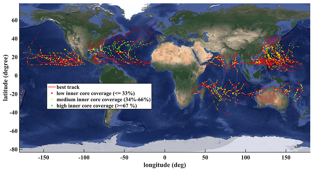 In the figure, the red lines are the track of each storm throughout its life cycle, the dots are when there was a CYGNSS overpass, and the color of the dot indicates how well we sampled the inner core of the storm. Every storm is sampled between one and three times a day, which helps monitor its development and capture sudden changes like rapid intensification. The impact our observations have on hurricane forecast skill is an active area of research by the CYGNSS science team. One recent example is work by researchers at the NOAA Hurricane Research Division that is highlighted in this figure.