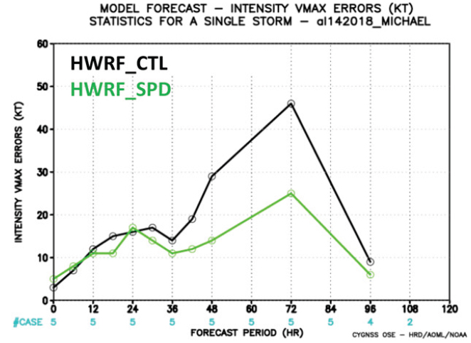 The figure shows the error in the operational forecast of maximum wind speed during Hurricane Michael’s rapid intensification, which occurred between 36 and 72 hours into the forecast (black line), and the reduced error that would have been present had CYGNSS observations been included (green line). The peak error is reduced from about 45 to 25 knots, or cut almost in half.