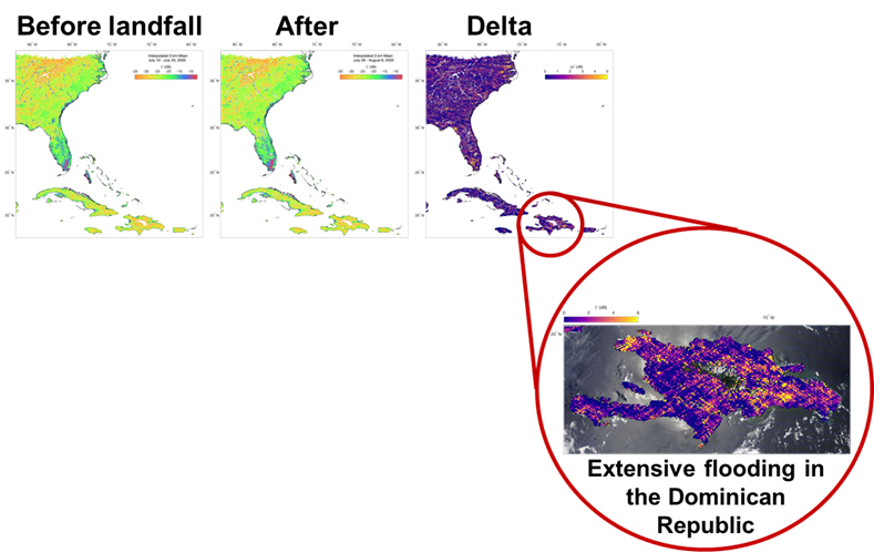 The “Delta” map shows the change in surface reflectivity from before to after landfall. The extensive flooding that occurred in the capital city of Santo Domingo is highlighted by bright yellow (high delta) areas.