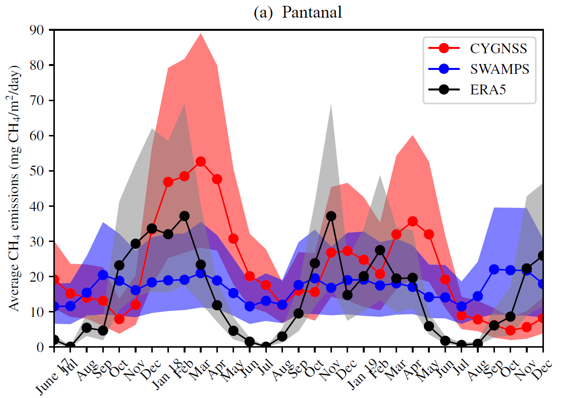 Inland water body maps produced by CYGNSS have two distinct properties. One, which derives from the large number of satellites in the constellation, is their ability to be updated often. This allows them to capture sudden changes like flood events. The other, which derives from the use of GPS signals that can penetrate through clouds, rain and vegetation canopies, is their ability to map wetland extent in heavily vegetated regions. One exciting new application of this capability is improved prediction of methane emission from wetlands. The accuracy of a global wetland methane emission model was evaluated when initialized by three different water masks. The results are shown in the following figure.