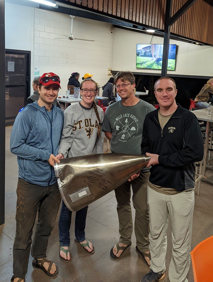 Cool indeed. We brought the nose cone to the Boat Club, and the rest of the evening we posed for pictures with the nose cone and passed it around so folks could touch something that had been to space. The next day while buying some snacks at the grocery store, I am identified by my American accent and asked how the launch went: “I finally got to see this one, the weather was right!” exclaimed the cashier.