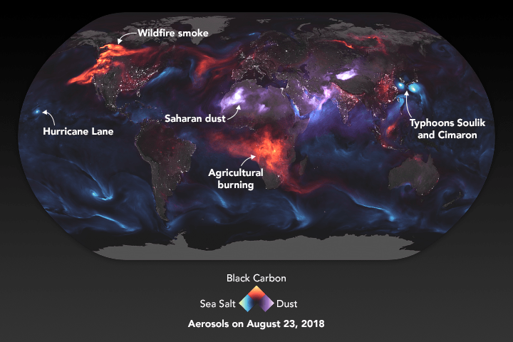 Why study them? Because those particles influence air quality, sometimes making it unhealthy to breathe, especially if you have asthma or heart and lung conditions. Pollution and smoke don’t observe borders – we all share Earth’s air — so it’s important to know something about the sources and types of particles floating around us. On the positive side, the bits of mineral dust or smoky aerosols can sometimes fertilize the ocean, providing nutrients for phytoplankton to bloom.