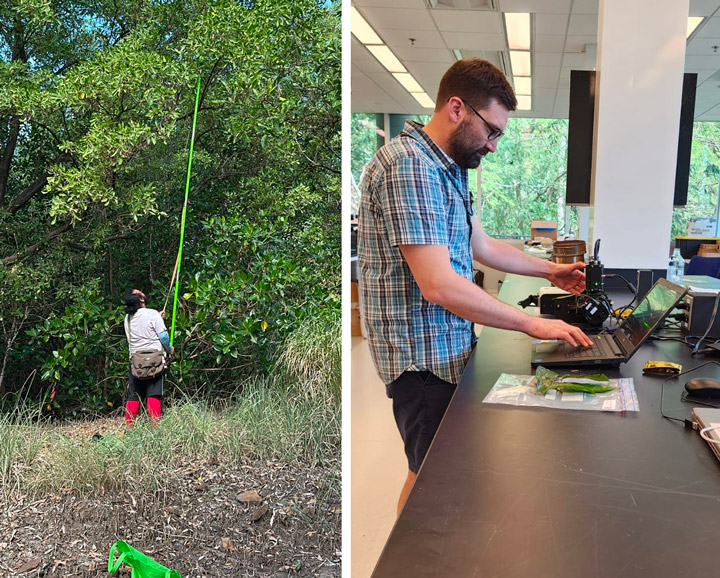 During the past few days, canopy trees at several sites, including from tall mature forests and younger stands, as well as samples from mangrove forests, have all come into the lab. Sampling and processing continue even as the aircraft waits for better weather.