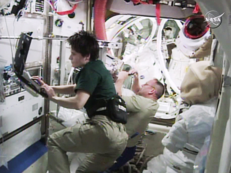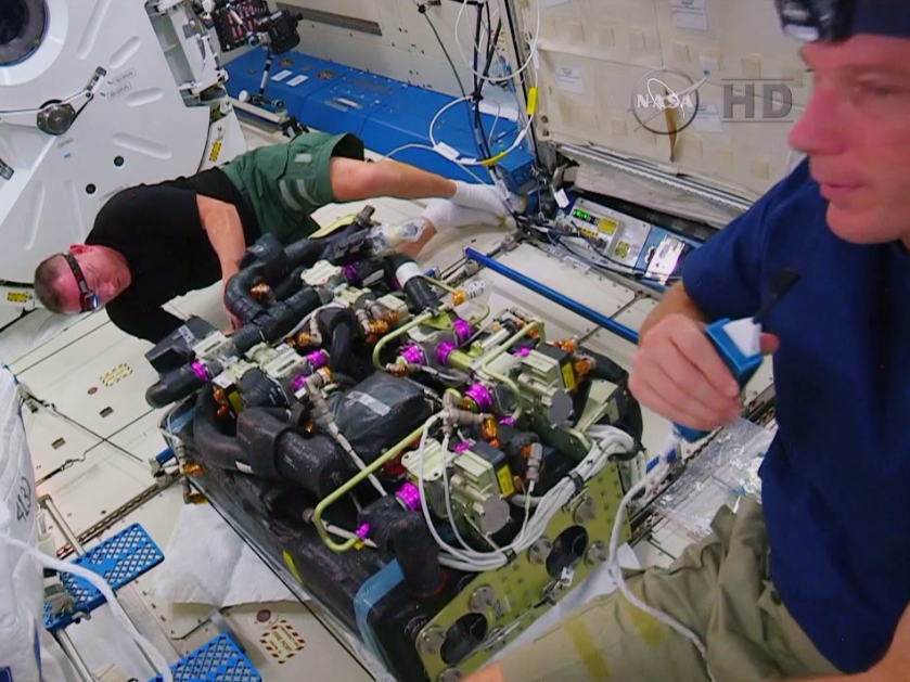 Italian astronaut Samantha Cristoforetti and Commander Barry Wilmore began fan pump separator replacement work Tuesday on a U.S. spacesuit. Cristoforetti started her day with medical science collecting saliva and urine samples for stowage in a science freezer. NASA astronaut Terry Virts worked on a variety of science including updating Ultrasound scanner software, checking a botany …