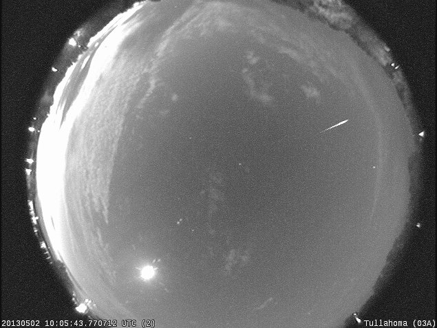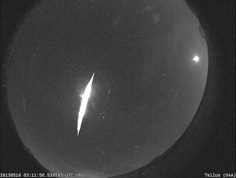 The NASA All Sky Fireball Network detected this beauty on May 16, 2013 at 03:11:50 UTC. Observed by 6 meteor cameras, this fireball penetrated deep into the atmosphere, making it down to an altitude of 36 km (22 miles).A view of the fireball from Cartersville, Georgia. (NASA/MEO)The 350 gram meteoroid responsible for this brilliant display …