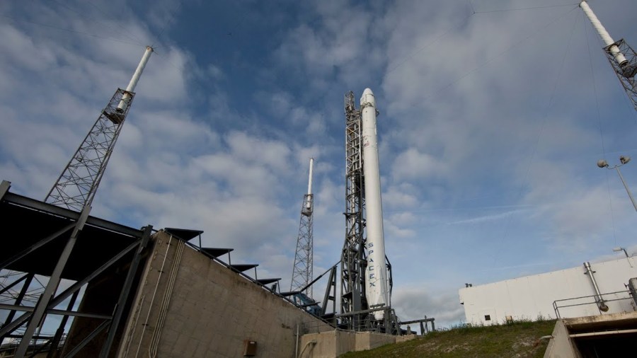 The support structure against the Falcon 9 rocket, called a strongback, has retracted to launch position.