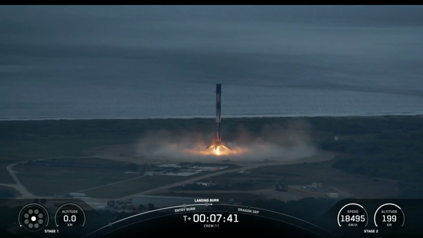 Back on Earth, the first stage of the SpaceX Falcon 9 rocket has completed its descent and landed at the company’s Landing Zone 1 at Cape Canaveral Space Force Station in Florida.
