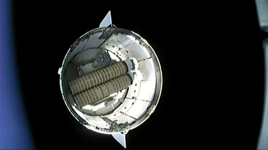 With Falcon 9 second stage engine cutoff, the Dragon cargo spacecraft has separated from the second stage and is flying on its own. Next up, the nosecone opening sequence will be completed. The nosecone protects the spacecraft’s docking ring and navigation sensors.