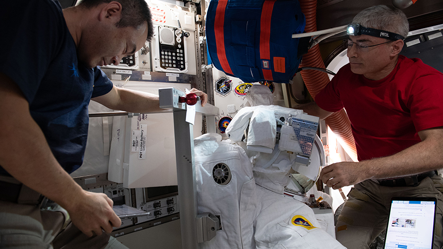 Payloads Cell Biology Experiment Facility (CBEF) humidifier installation: The crew installed the CBEF Incubator Unit (IU) humidifier on the micro-gravity CBEF IU. The Cell Biology Experiment Facility (CBEF) is a Japan Aerospace Exploration Agency (JAXA) subrack facility; it is an incubator with an artificial gravity generator. CBEF is housed in the Saibo (living cell) Experiment …