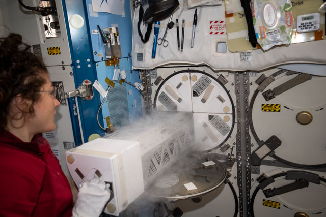 Electro-static Levitation Furnace (ELF): The crew replaced the ELF gas bottle unit in the ELF facility. ELF is an experimental facility designed to levitate, melt and solidify materials by containerless processing techniques using the electrostatic levitation method. With this facility thermophysical properties of high temperature melts can be measured and solidification from deeply undercooled melts …