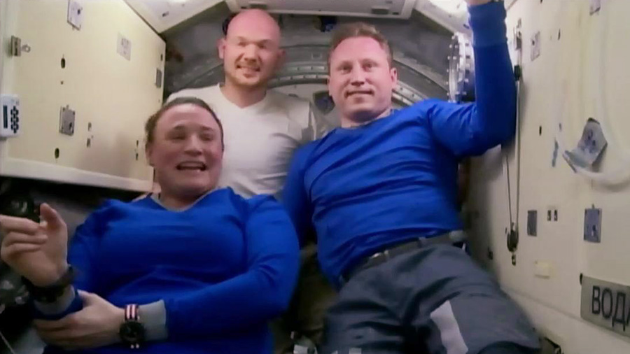 Departing Trio Boards Soyuz Crew Ship, Prepares to Undock