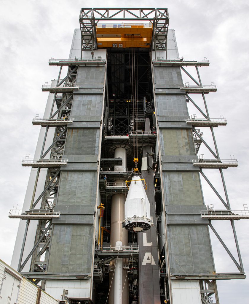 The spacecraft, secured inside the fairing, was lifted by crane and vertically installed to the top of a United Launch Alliance Atlas V rocket. The rocket will remain inside the VIF until the day before launch, when it will then roll out to the launch complex in preparation for liftoff.